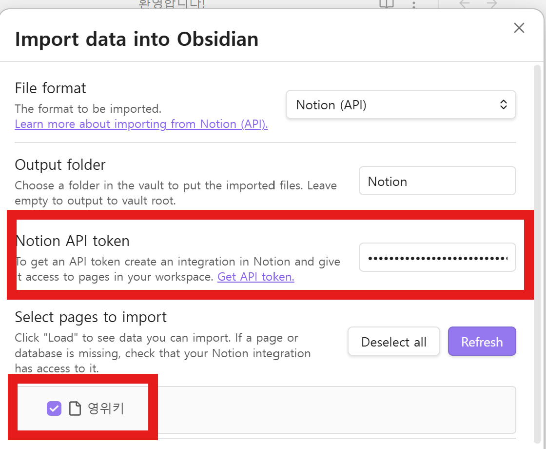 나는 토큰이랑 페이지 이름만 선택하고 Import 설정함