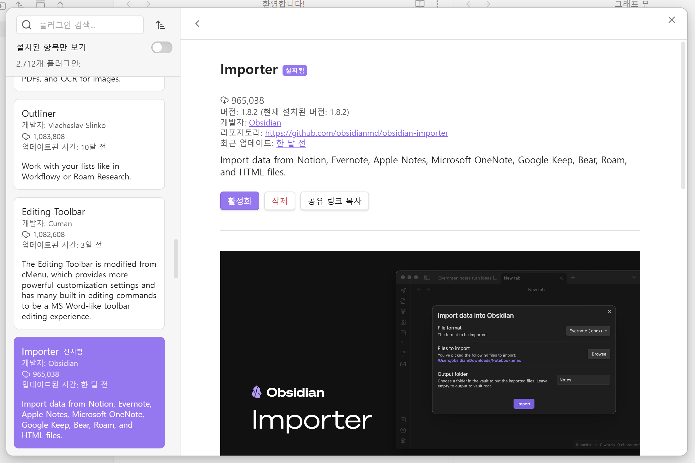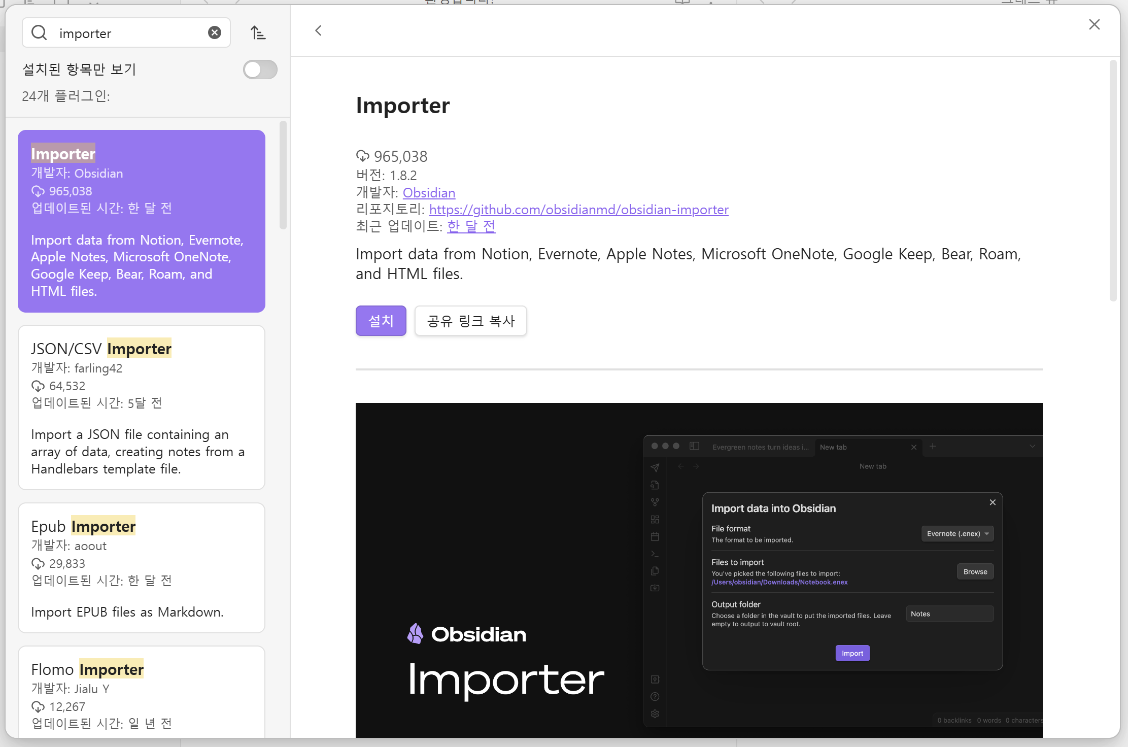 옵시디언은 이미 설치되어 있을 거라고 가정한 상태로, 옵시디언에서 Importer 플러그인을 설치해야 한다.